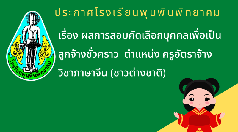 ประกาศโรงเรียนพุนพินพิทยาคม เรื่อง ผลการสอบคัดเลือกบุคคลเพื่อเป็นลูกจ้างชั่วคราว ตำแหน่ง ครูอัตราจ้างวิชาภาษาจีน (ชาวต่างชาติ)