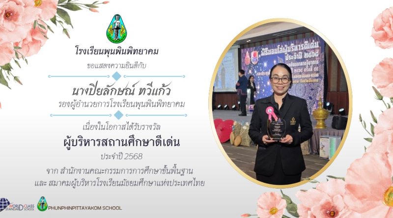 รงเรียนพุนพินพิทยาคม ขอแสดงความยินดี กับ นางปิยลักษณ์ ทวีแก้ว รองผู้อำนวยการกลุ่มบริหารทั่วไป ในโอกาสได้รับรางวัลผู้บริหารสถานศึกษาดีเด่น ประจำปี2568 จากสำนักงานคณะกรรมการการศึกษาขั้นพื้นฐานและสมาคมผู้บริหารโรงเรียนมัธยมศึกษาแห่งประเทศไทย