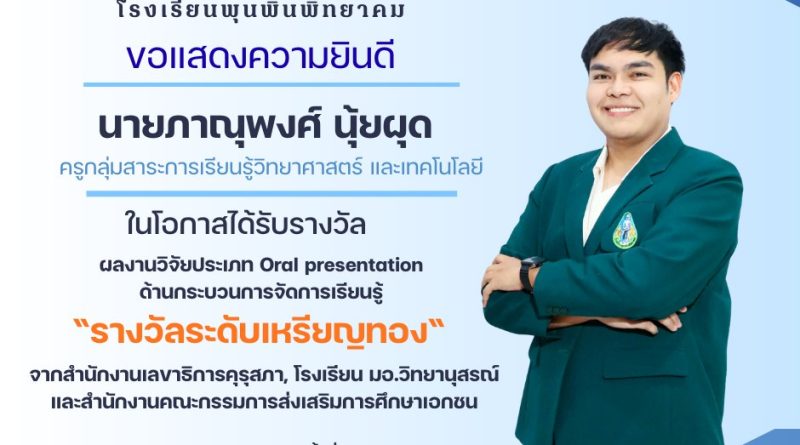 โรงเรียนพุนพินพิทยาคม ขอแสดงความยินดีกับ นายภาณุพงศ์ นุ้ยผุด ครูกลุ่มสาระการเรียนรู้วิทยาศาสตร์และเทคโนโลยี เนื่องในโอกาสได้รับรางวัล ผลงานวิจัยประเภท Oral presentation ด้านกระบวนการจัดการเรียนรู้ “รางวัลระดับเหรียญทอง“ เวทีวิชาการ มอ.ว. ครั้งที่ 3 มหกรรมการศึกษาเพื่อการพัฒนาที่ยั่งยืน “มอ.ว. ก้าวอย่างยั่งยืน”
